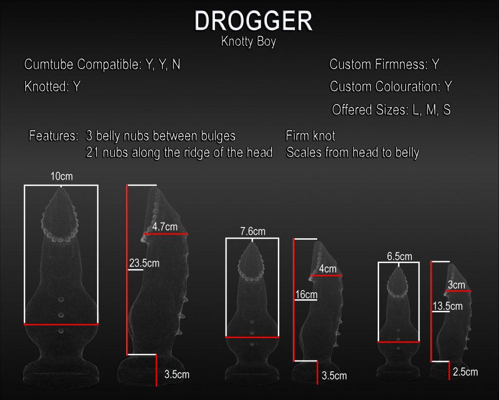 Drogger, inspired by both canine and lizardian backgrounds, sates many desires at once. The soft nubs behind his piercing tip hits the deep, sensitive areas inside while the knot firmly tests out any entrance it finds willing enough to try and take him.