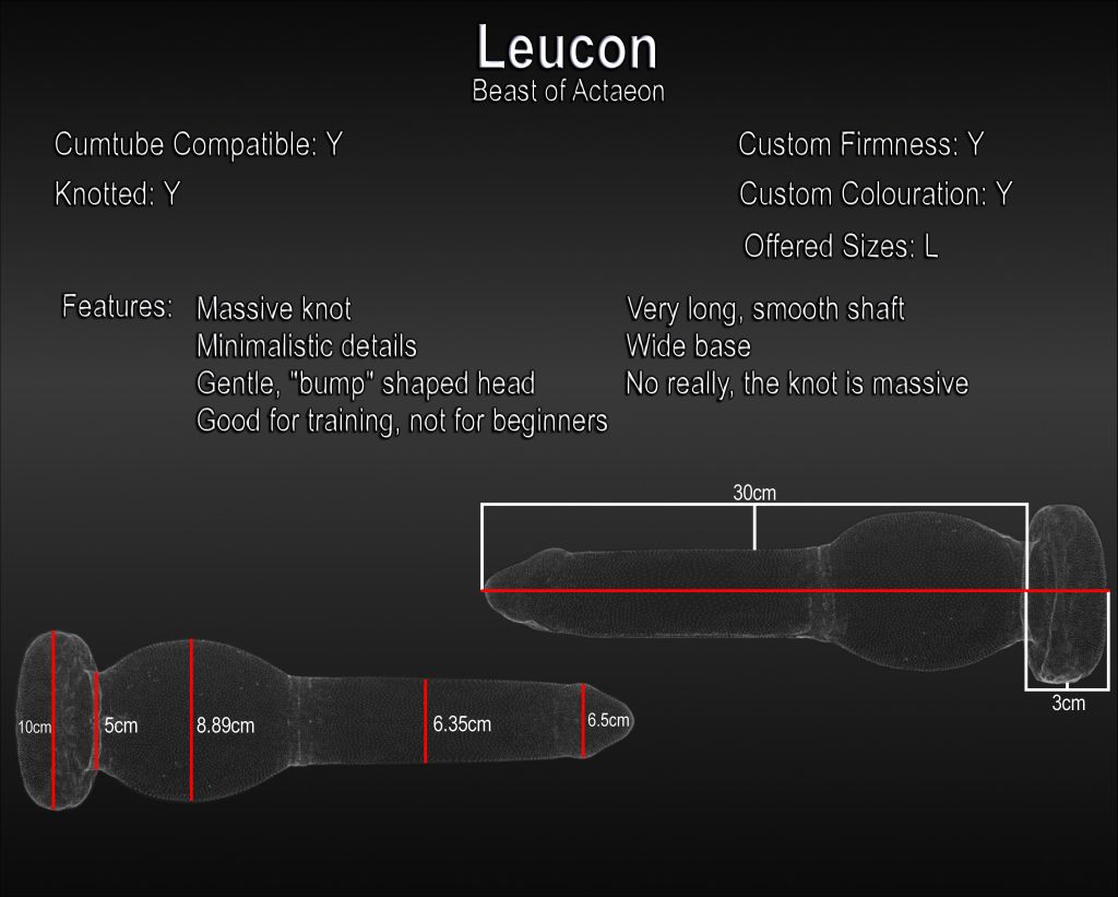 Certainly not meant for beginners, Leucon's member features a long shaft, topped with a forgiving and rounded point and seeking its home atop a firm, swollen knot, the width of which is known to make even the most adventurous of bedtime companions cry out in the heat of the night.