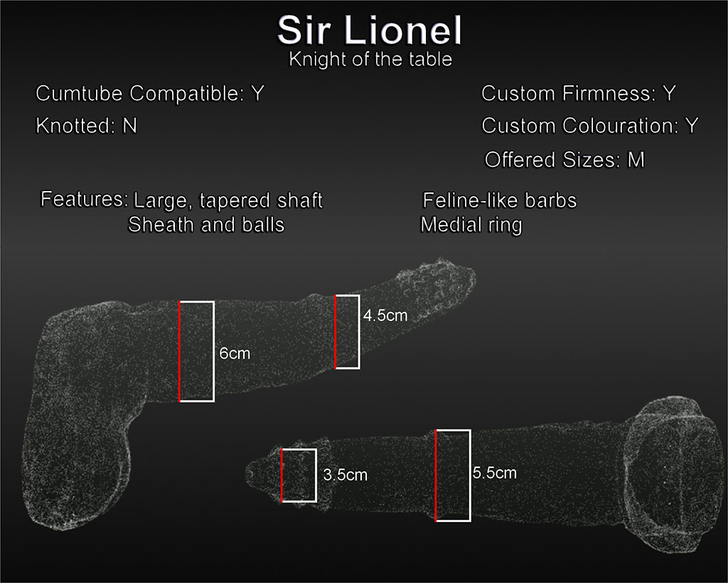 Unable to hide his uniquely mixed heritage, Lionel's naked form boasts a strong, thick shaft, a sturdy medial ring, and the gentle nubs of residual barbs. These qualities prove perfect for providing titillation at the entrance of any bedfellow lucky enough to grace his chambers, as well as satisfying even the most hungry of handmaidens.